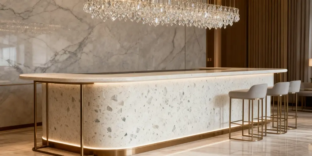 D9831 is a beige crystal quartz engineered to create a warm and bright commercial atmosphere. Its welcoming beige base is infused with clear, sparkling recycled glass and crystal particles, creating a surface that is both inviting and richly textured. This is an excellent choice for designers and developers seeking a material that combines high durability and easy maintenance with a warm aesthetic.