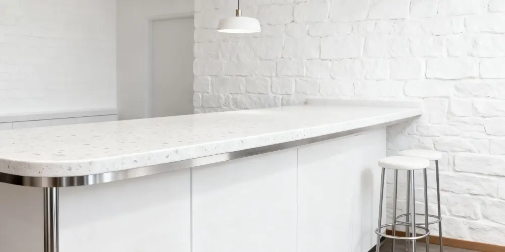 Our D9832 Ice White quartz slab provides a striking, contemporary aesthetic for commercial spaces. Large, irregular transparent aggregates within a bright white background catch and refract light, creating a dynamic and crisp visual effect. This design is perfectly suited for spaces that need to evoke a sense of spaciousness, brightness, and hygiene, such as retail counters, hotel and airport lobbies, food service areas, and healthcare facilities.