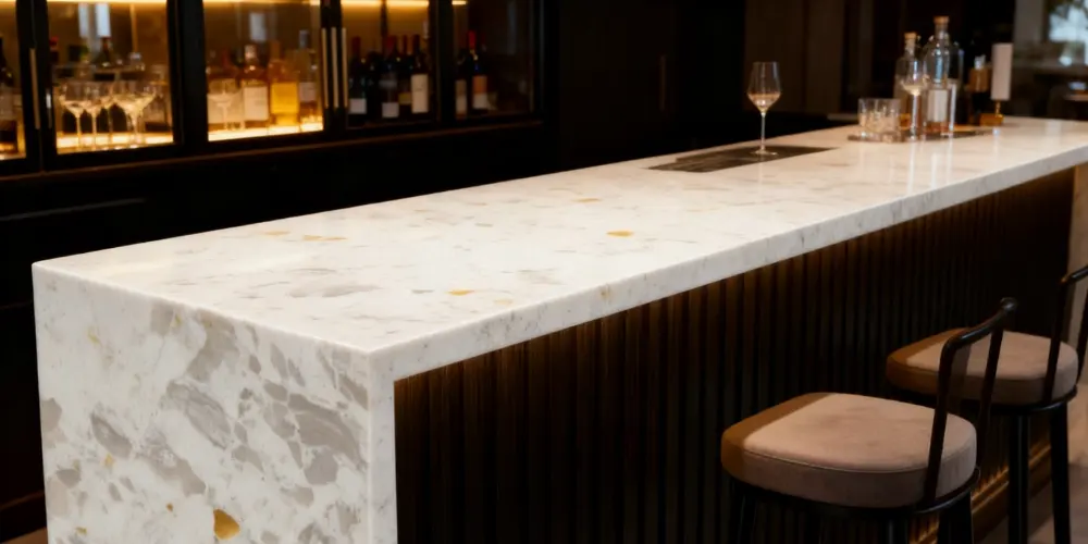H9971 is an engineered quartz slab designed for flagship projects aiming to create an atmosphere of pure luxury. Its bright white base, interwoven with soft grey veining and brilliant yellow crystal particles, creates a rich, multi-layered visual effect comparable to rare natural stone. For designers and developers looking to make an impressive focal point, this is a top-tier specification that unites a magnificent appearance with superior performance.