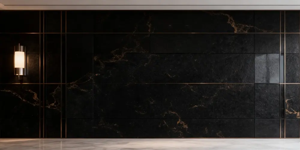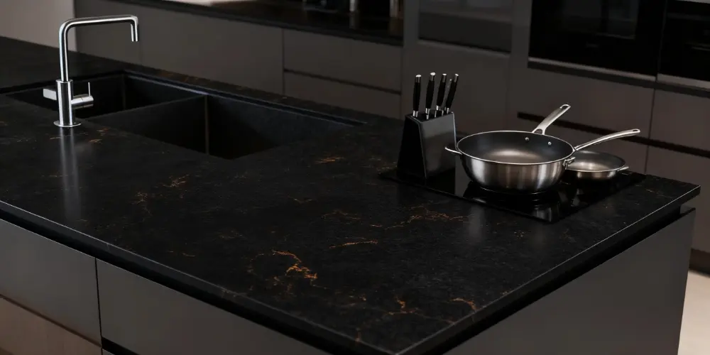 Our K9902 quartz countertop offers a material choice rich with character for commercial interior design. The matte-finished deep black background creates a strong contrast with the warm, metallic-sheened brown veins, resulting in a surface that is deep, warm, and tactile. This unique aesthetic makes it a highly expressive focal point in feature restaurants, themed bars, boutique hotel lobbies, and high-end residential projects.