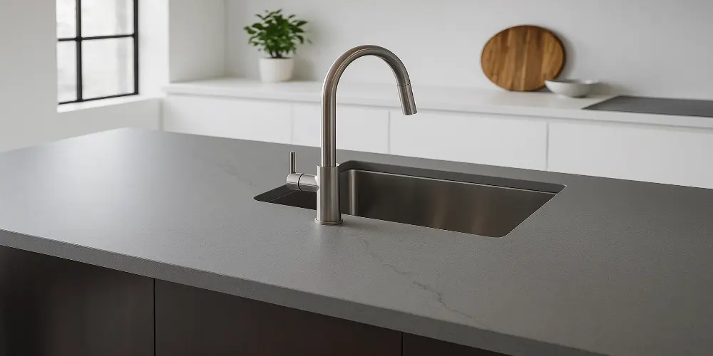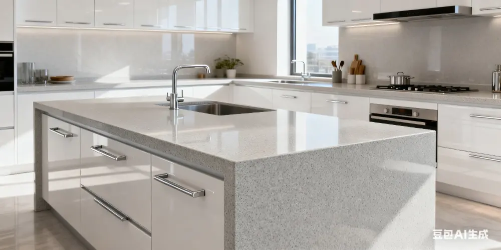 Our N9805 Pearl White quartz stone is designed to meet the dual demands of aesthetics and functionality in modern construction projects. Compared to pure white, its soft off white base tone brightens interiors while offering a more forgiving and approachable look that better conceals minor dust and water spots in daily use. The fine grey and brown particles on the surface add subtle depth and ensure visual continuity and consistency, even across different supply batches in multi unit projects.