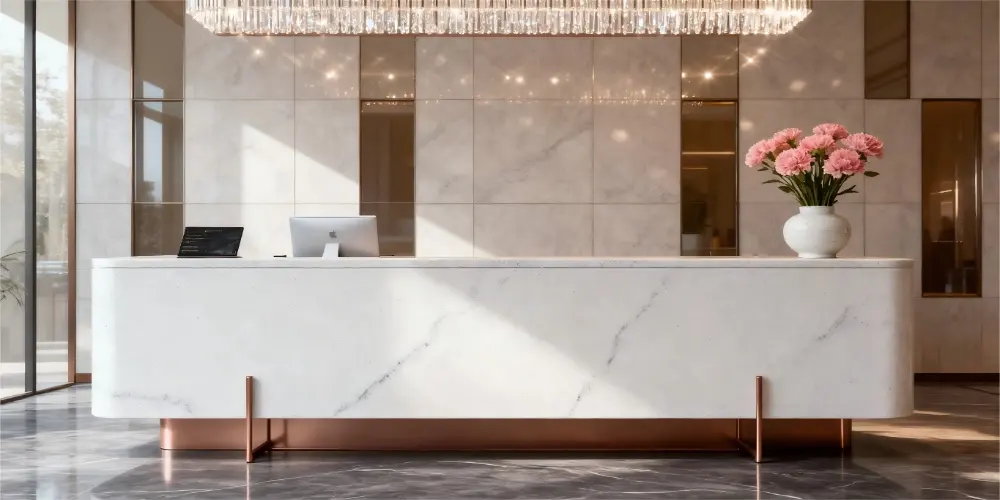 Our S1020 quartz salb is the perfect fusion of purity and detail. More than just a solid color, its faint, soft veining adds organic depth to the design, preventing visual monotony while maintaining an overall minimalist feel. This understated design makes it an excellent choice for projects such as healthcare facilities, Class-A office buildings, and high-end residential developments, where a calm, professional, and spacious atmosphere is desired.
