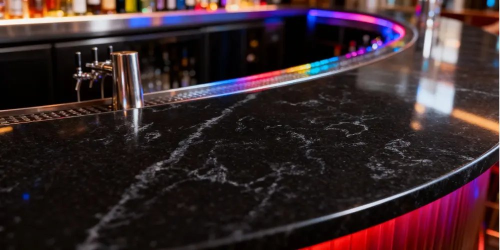 Our S1037 Honed Black quartz stone provides a pure and powerful design language for professional projects. Its uniform matte (honed) finish lends the surface a unique tactile quality and visual depth, effectively eliminating glare and showing fewer fingerprints than polished black alternatives. This makes it ideal for conference tables, high-end retail displays, restaurant bars, and modern residential kitchens. The subtle, faint markings within add a touch of organic character to the solid black base, preventing a flat look in large-scale applications.